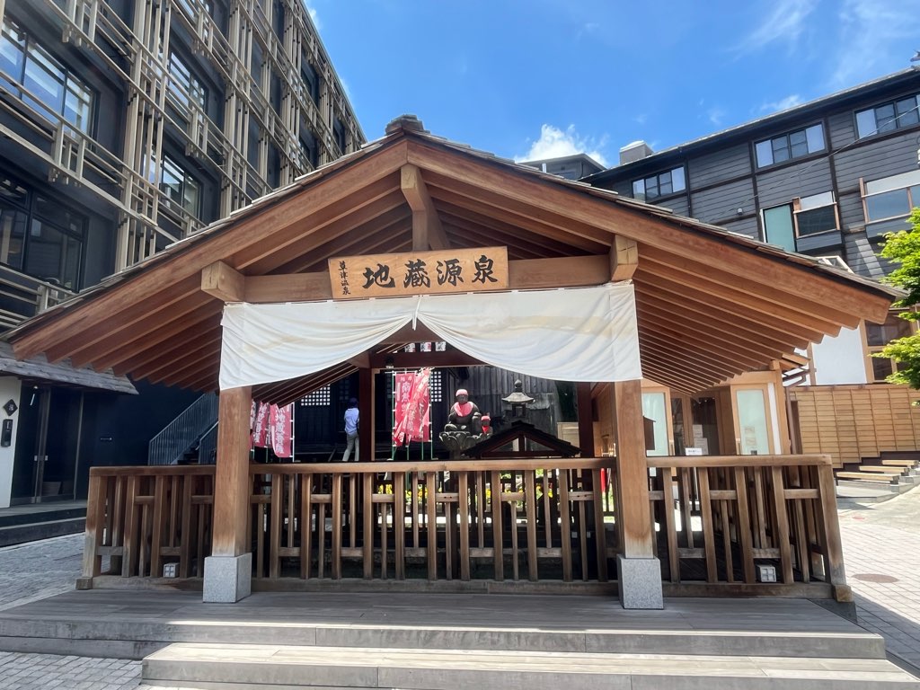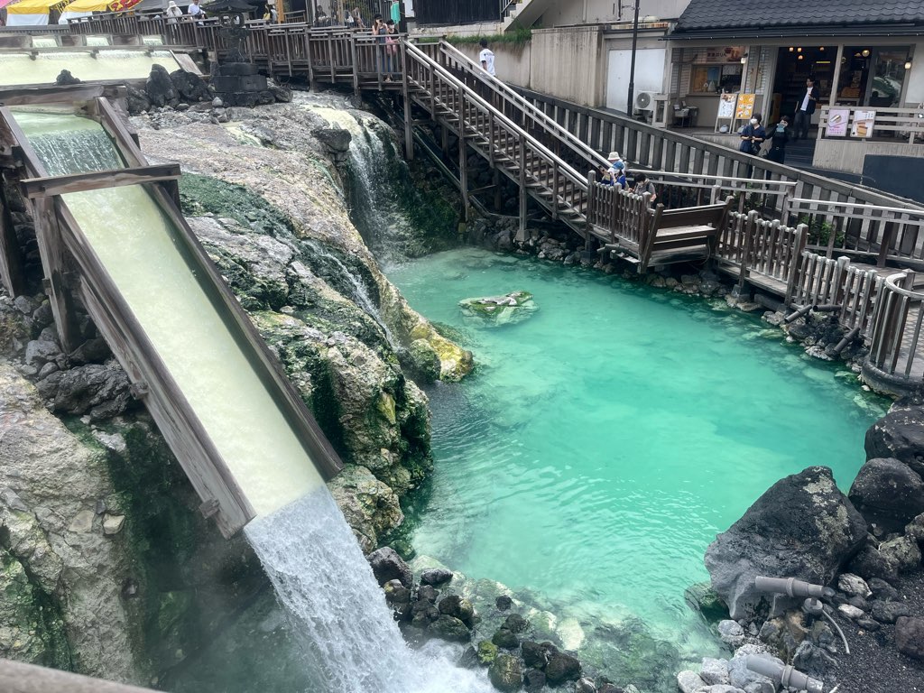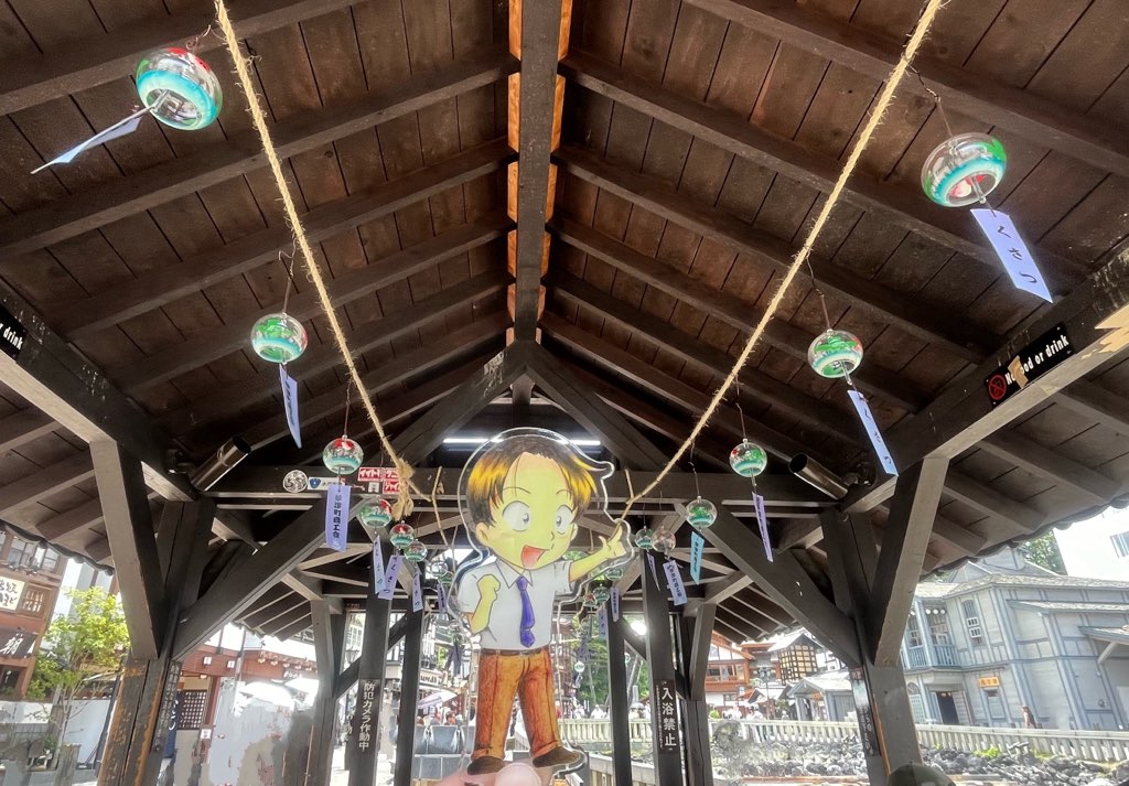 そこそこ暑いのに足湯にも浸かってきた(笑)足湯の屋根のところにあった沢山の風鈴がとても涼しげでいい感じでした!ここだけじゃなくて、湯畑全体に風鈴がたくさん飾られていてとてもかわいかったです🎐