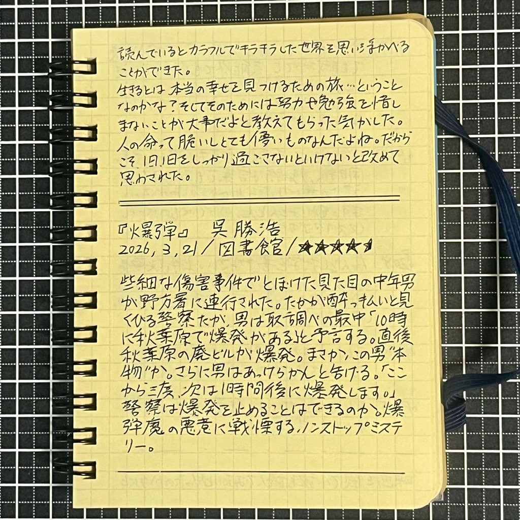 Review 2026/03/25 Wed 「爆弾」 呉勝浩 感想 今回はネタバレはないはず!たぶん!! 映画館で観た時実はめちゃくちゃ席運が悪くて全然映画に集中できなかったので、小説でリベンジできてよかったです! 字汚いし何ヶ所か書き間違いあるけどツッコミはなしで…(笑) #本・マンガ 続きを読む 畳む