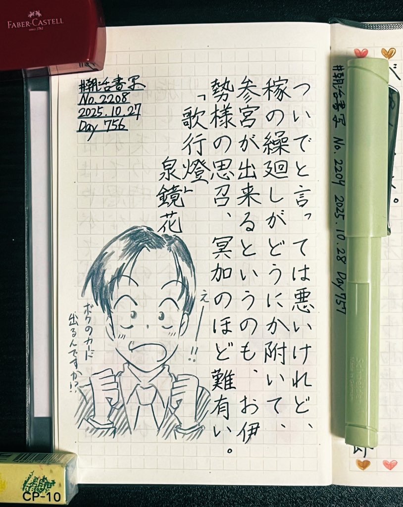 ちょっとー!朝活書写さんこんなのもお題にしてくれるんですか!😍ミサオちゃんもきっとこれ覚えてるんだよな…とか考えながら書いてる間ずっとニヤニヤしてしまいましたwww