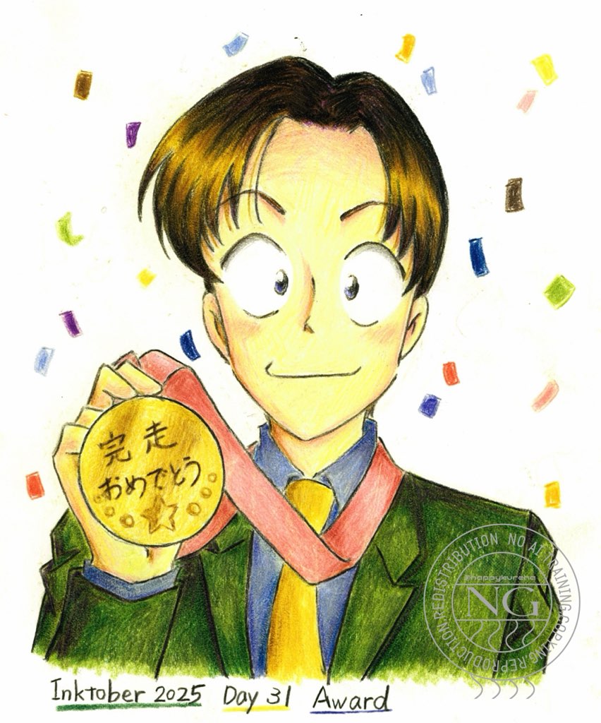 インクトーバーも今回でラスト!ということで、ベタですがミサオちゃんと完走おめでとうメダルです🎖️最後なので本気塗りで塗ったらすごくかわいくなって大満足です🥰ラストを飾るのにふさわしい1枚になったと思います!